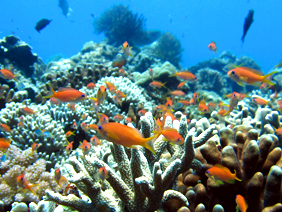 島の南側にはユビエダハマサンゴの群生がありキンギョハナダイ・ハナゴイが乱舞しており、