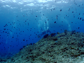 座間味島唐馬浜の南に位置するポイント。メインの根の周りにはスズメダイ各種の大群が凄いです。