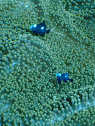 イソギンチャクと共生している魚。 よくクマノミも一緒に共生しているが、どうも力関係はクマノミの方が上らしく いつもクマノミに邪魔者扱いされている。 幼魚は非常に可愛いですが、成魚は普通のスズメダイであまり相手にされません。 以前、クマノミに食べられている瞬間を見たときはショックを受けました。 |